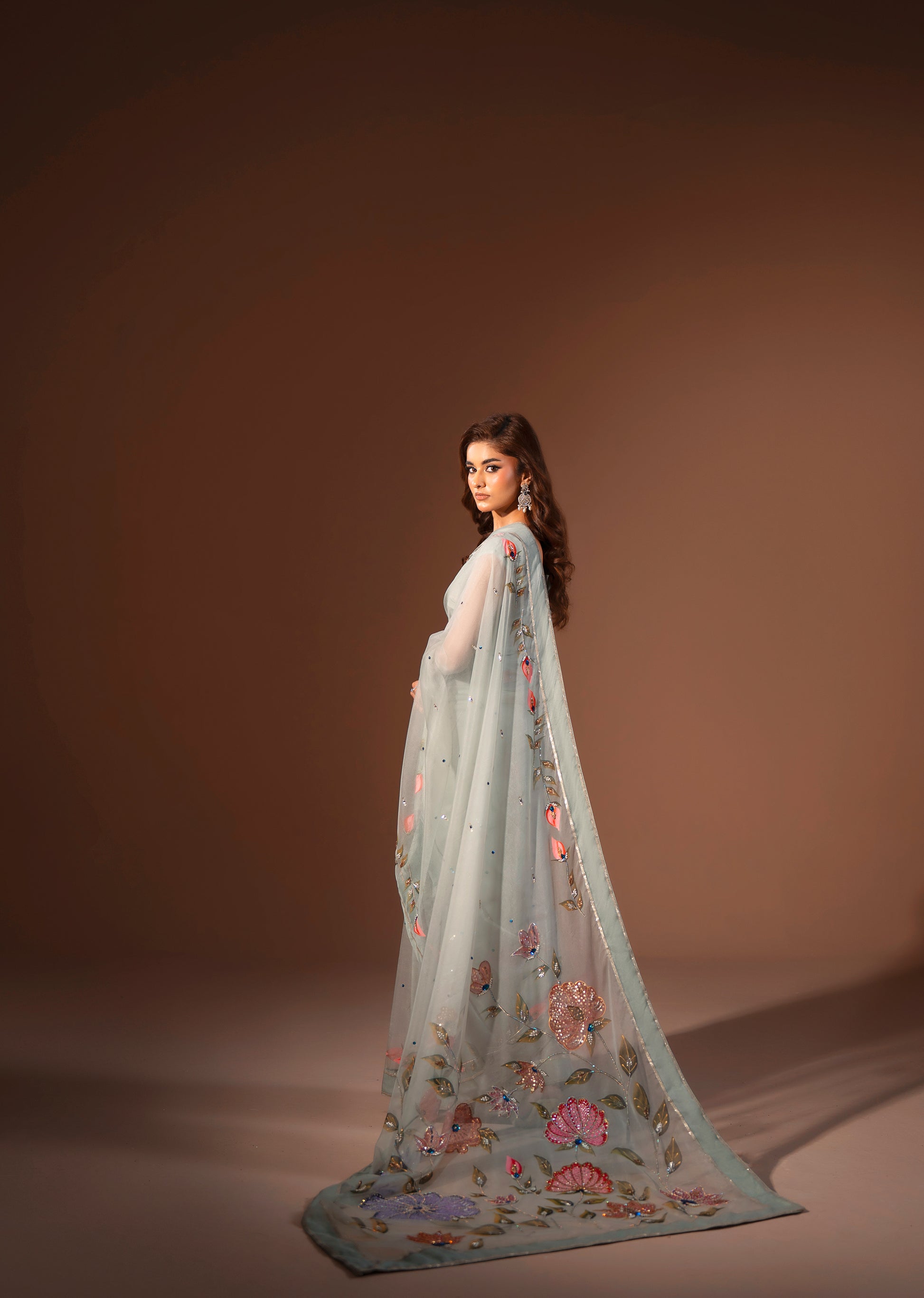 This exquisite saree is crafted from luxurious silk tissue, admired for its delicate texture and luminous sheen that exudes sophistication. The fabric drapes effortlessly, creating a graceful and refined silhouette.