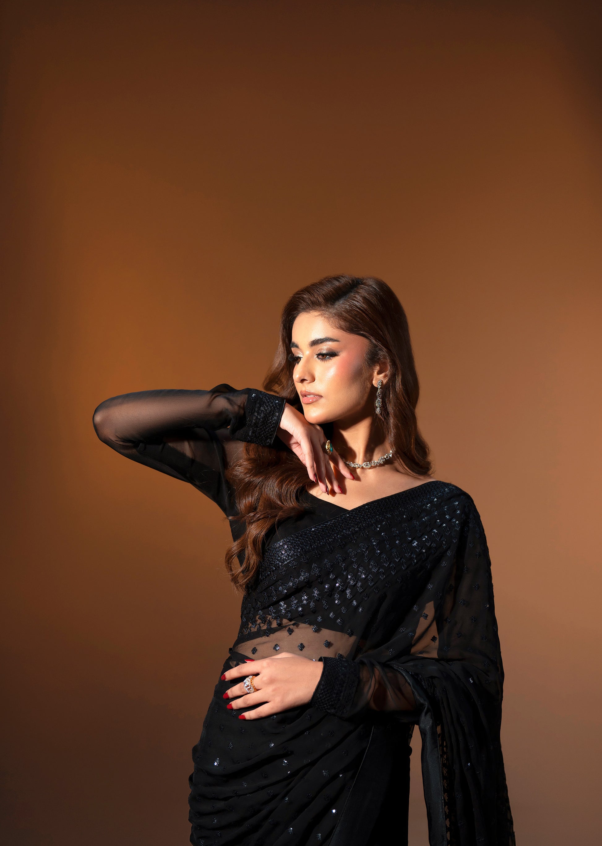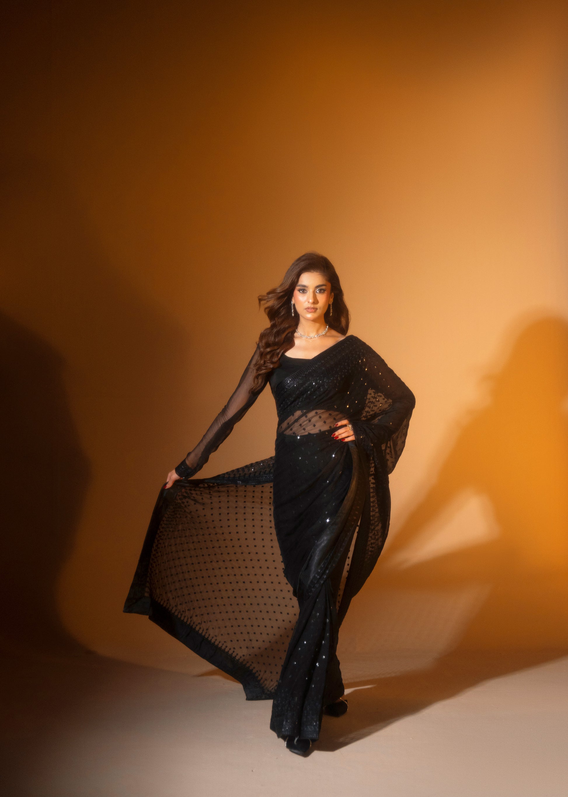 This elegant saree is crafted from a pure chiffon base, offering a lightweight, airy texture with a soft and graceful drape. The delicate chiffon fabric flows effortlessly, enhancing comfort while maintaining a refined and sophisticated look.