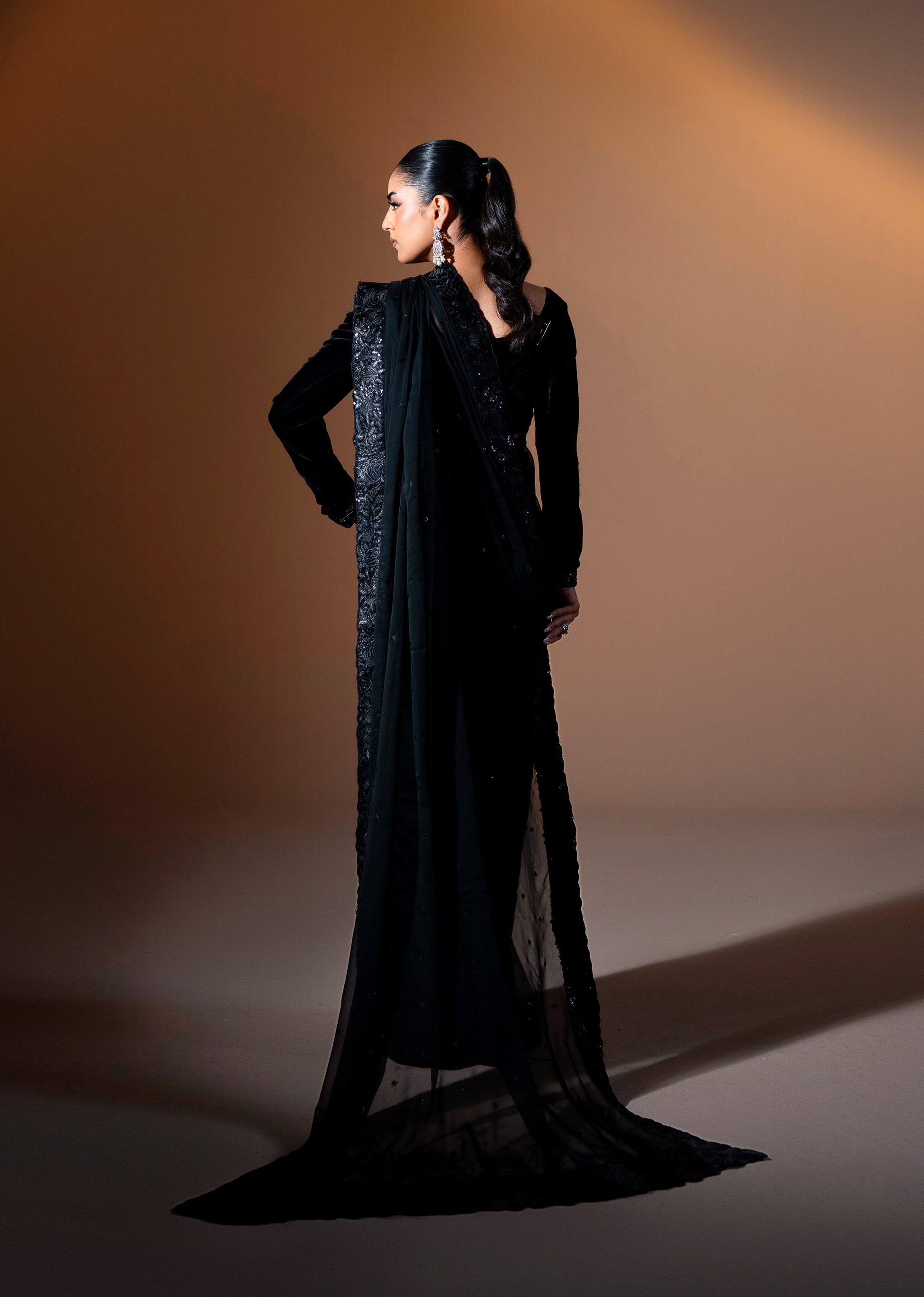 The pallu is highlighted with dense, richly designed borders, making it the focal point of the saree and lending a luxurious finish. Adding to its refined appeal, the saree also features decorative borders along the wrist area, providing a coordinated and polished look when draped.