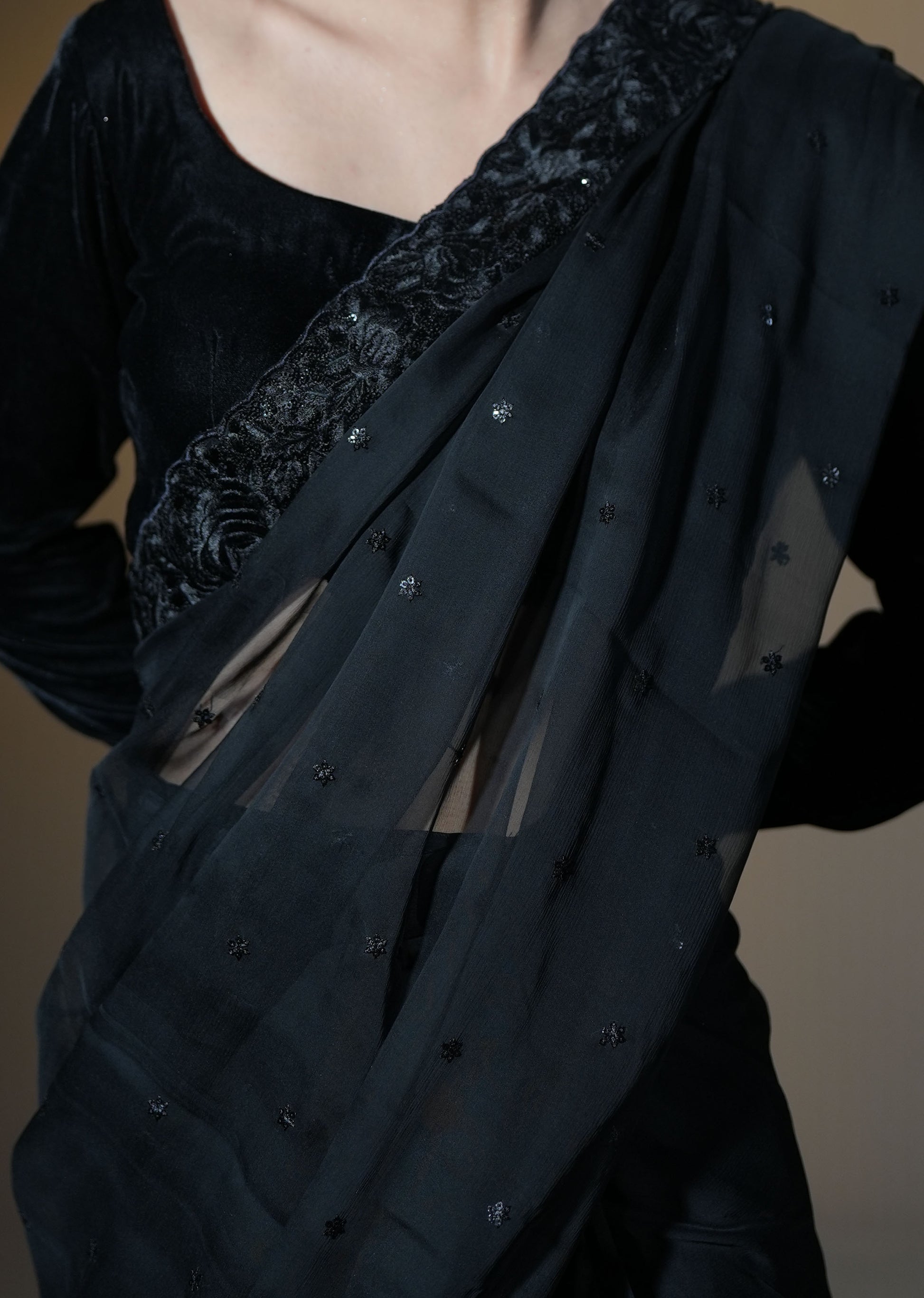 The saree is enhanced with viscose embroidery featuring delicate sequin filling, adding subtle shimmer and texture across the fabric. The sequin work is finely detailed, creating a balanced blend of elegance and glamour without appearing heavy.